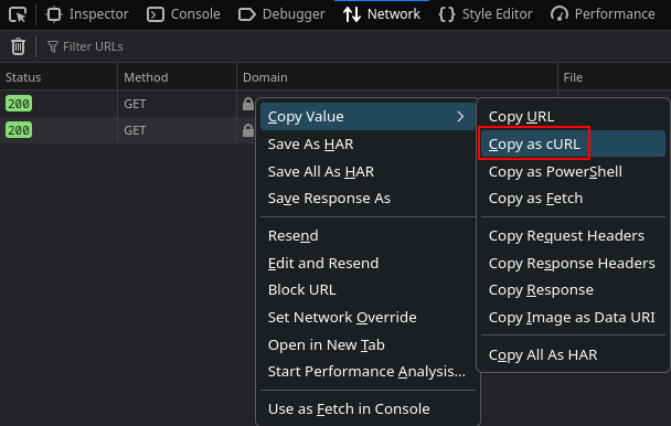 Teniendo eso en cuenta, empecé a explorar la segunda posibilidad. Copié el request del navegador en formato cURL (usando las herramientas de desarrollador), y ejecuté el request desde la terminal.