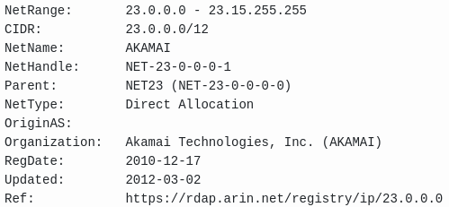 Tanto la dirección IP como los dominios de los CNAMEs son propiedad de Akamai, lo cual explica tanto el problema inicial de “latencia infinita”, como la inconsistencia al usar requests aparentemente similares en diferentes sesiones de comunicación.