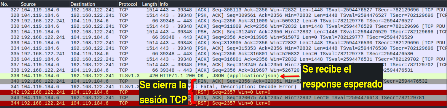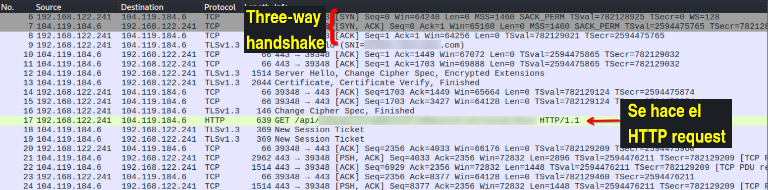 Como se puede ver en las capturas de pantalla, la sesión TCP se establece con un three-way handshake, el cliente (mi navegador) envía el request, el servidor lo recibe y empieza a enviar los datos del mismo. Finalmente, el cliente envía un paquete FIN ACK para cerrar la sesión con el servidor, y la comunicación termina.