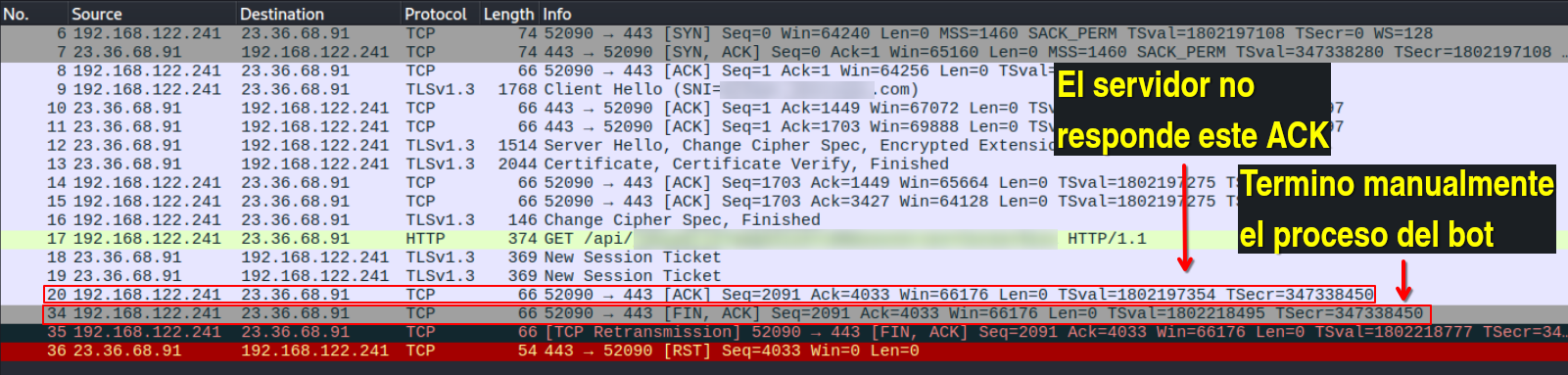 La conexión se establece normalmente igual que en el ejemplo anterior, pero tan pronto como el servidor recibe el HTTP request, deja de responder, sin enviar ningún paquete FIN o RST. Al terminar forzosamente el proceso de mi bot, el mismo envía un FIN ACK al servidor, y el este contesta con un RST, lo cual asumo que significa que el servidor ya había terminado la sesión de su lado, y no tiene “conocimiento” de la sesión que mi cliente había establecido hace unos segundos.